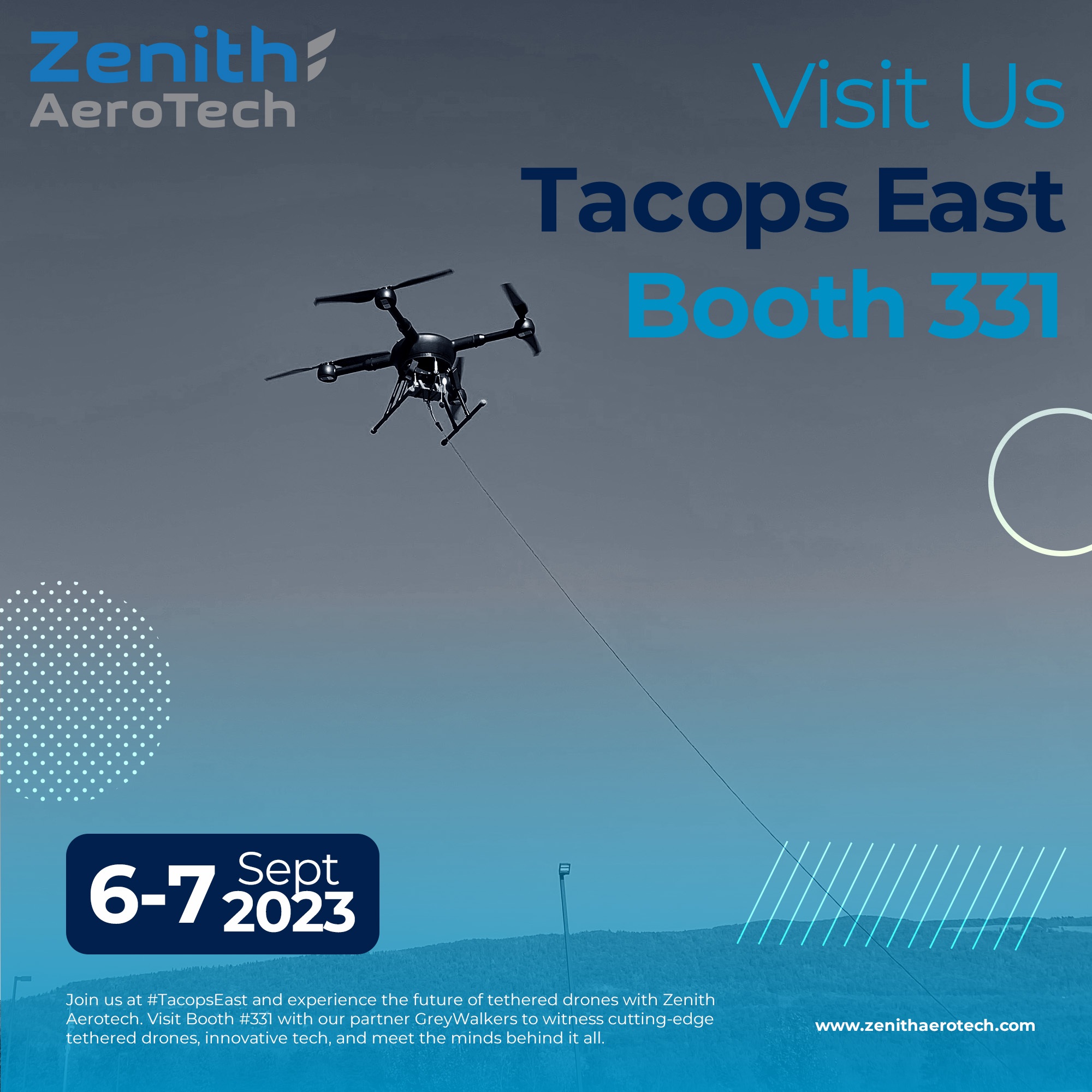 Join us at #TacopsEast and experience the future of tethered drones with Zenith Aerotech. Visit Booth #331 with our partner GreyWalkers to witness cutting-edge tethered drones, innovative tech, and meet the minds behind it all. TACOPS EASTLAW ENFORCEMENT TACTICAL TRAINING CONFERENCE & EXPO CRYSTAL GATEWAY MARRIOT – ARLINGTON, VA SEPTEMBER 6-8, 2023 BOOTH 311