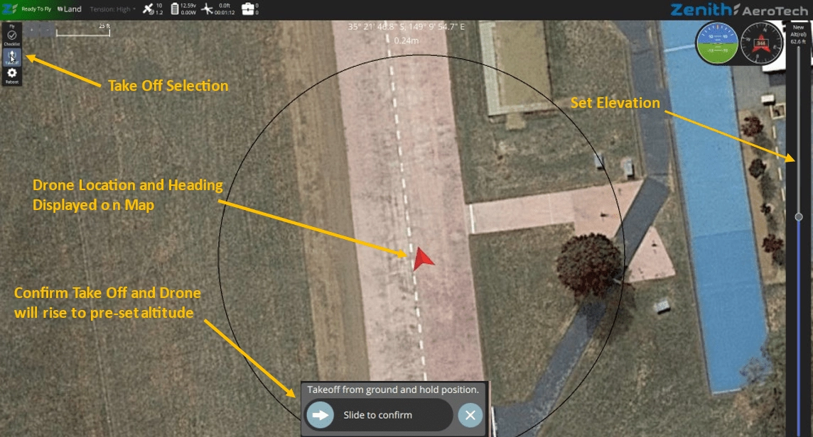 Once the system checks are complete, all blocks will show green. Operator can the click on the “TAKE OFF” button to set the desired altitude and then launch by sliding the confirm button.